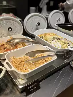 ・Main dishes: A luxurious lineup of main dishes. The domestic beef roast beef is enhanced by gravy sauce, highlighting its umami. The rotisserie bone-in pork loin is juicy and fragrant, allowing you to fully enjoy the meat’s flavor. The seafood gratin pairs rich white sauce with seafood perfectly, making it a satisfying dish.