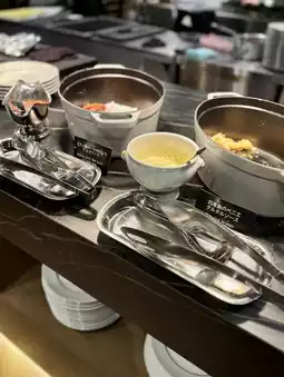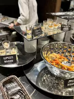 The lunch buffet includes appetizers, salads, bread, fritters, rotisserie sauté, stewed dishes, rice dishes, soups, main dishes, and desserts. Among them, domestic beef roast beef and rotisserie bone-in pork loin are popular menu items. This buffet, available on both weekdays and weekends, also offers an all-you-can-drink plan, allowing you to fully enjoy a special lunchtime.