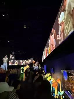 The interior exhibition starts from the Mediterranean and unfolds through ocean currents, using technologies like video projection and holographic projection to showcase ecology, environmental protection, wind power initiatives, and marine biodiversity.