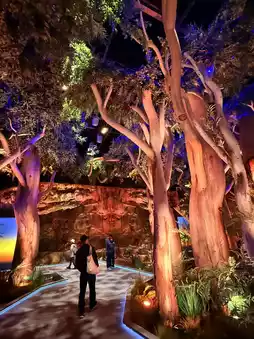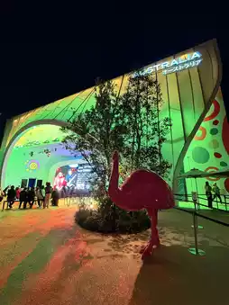 The Australia Pavilion was actually the one I drew a ticket for seven days ago. Later, I found out you only need to wait about 1 to 2 minutes to enter. The first exhibition area is themed around forests, trying to let visitors experience Australia’s nature through sounds and scents. The second area features unique multi-screen images showcasing Australia’s marine nature and biodiversity. In the evening, there are singer performances and beer stalls where you can enjoy a drink and feel the charm of Australian music.