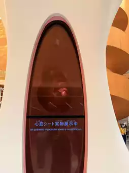 First is the Osaka Health Care Pavilion, a very popular venue. Besides the reservation and long queues for experiencing future medical technology, the left passage offers a fast-track entry without waiting. Fifty years ago, the Osaka Expo proposed the concept of a bathing machine, and today many Japanese care institutions have similar designs. This time, 50 years later, the bathing machine not only includes physiological data monitoring and adjusts water temperature based on age and physical condition but also aims to be a machine that cleanses body, mind, and spirit. Further inside is the iPS cell patch display area, showcasing medical advancements where iPS cell layers can treat severe heart diseases. You can also see actual iPS cell patches in petri dishes.