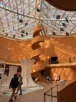 The EXPO Hall is the main pavilion of the Expo, continuing the legacy of the Sun Tower from 50 years ago. Its dome is coated in gold, and from a distance, it looks like a hole in the sky, creating a sci-fi optical illusion. At night, 109 collected animation works are projected onto the shiny hat-like exterior wall. If you have time, you can rest on a chair and enjoy animations from around the world.