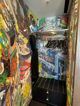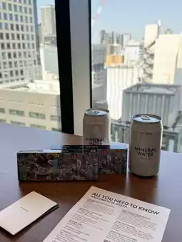 The Wonderful Room is about 39 tsubo (approximately 1,290 sq ft), boldly designed and full of fun. The room centers around a white bed, accented with orange and purple decorations, showcasing W Hotel’s signature stylish vibe. Geometric patterns on the carpet and walls add visual depth. The room is equipped with a Nespresso coffee machine and a MixBar, allowing guests to enjoy making their own drinks anytime. The most unique touch is the water served in a can, very much in W’s style!