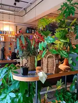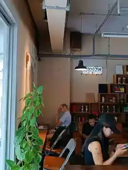 The café offers various seating options, including sofa seats, shared seats, and outdoor seating~