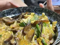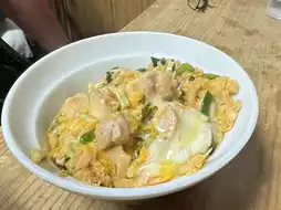 A Japanese rice bowl with chicken and egg mixed together, with a slightly sweet taste. The base flavor is a bit salty.