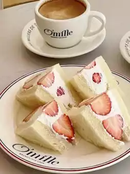 A strawberry sandwich filled with plenty of cream, looks adorable, and the plate with the shop’s name is also cute!
