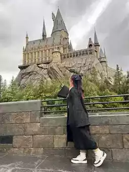 Having a butterbeer while looking at Hogwarts in the Harry Potter zone,