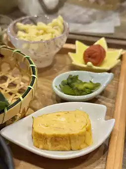 That day, there were 8 kinds of side dishes including pickled plum, rolled omelet, macaroni salad, and boiled greens.