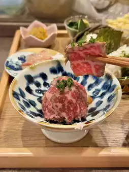 The meat set meal of the day featured Omi beef tataki, and the fish set meal had grilled salmon☺️
