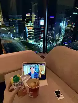 Before the flight home, Boom sat sipping coffee by the Osaka river,
