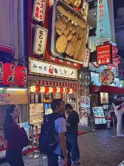 Walking into Dotonbori, my eyes were dazzled by the countless restaurants lining both sides of the street, neon lights shining brightly, and the nighttime view was truly breathtaking. Most importantly, the food here is unbelievably delicious! I had hot, round takoyaki filled with chewy squid, topped with sweet sauce and mayonnaise. It was so good that I ordered several more servings. There are also sushi, ramen, and plenty of snacks, making it fun to eat while walking around. The atmosphere is super cute too.