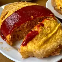- Giant Omurice (750 yen): Rice stir-fried over high heat in a Chinese iron pan, each grain distinct and packed with chicken pieces. Wrapped in a wafer-thin egg crepe and topped with tomato sauce erupting like a volcano, it’s a feast for both the eyes and taste buds.