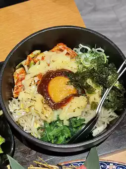 The cheesy stone pot bibimbap is legendary, bursting with aroma and flavor🍳 Finished off with a cocktail, the buzz was just right~ The restaurant has both a bar counter and private rooms, perfect for solo diners or groups. Conveniently tucked away in Shinsaibashi-suji, it’s the perfect energy boost after shopping✨