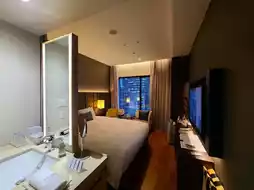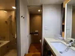 The room features a modern layout with an open sink, bathroom, and toilet separated into three sections, reflecting current hotel trends and making the space feel larger than the room size suggests. Amenities include large Mikimoto products and sample stands, adding a touch of luxury.