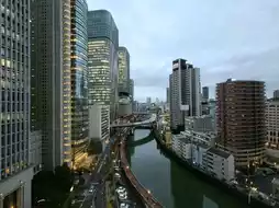 The window view faces Tosabori River, a river view with the Conrad and APA Hotel standing tall on either side. The dynamic Osaka cityscape is visible with cars speeding along the Hanshin Expressway above.