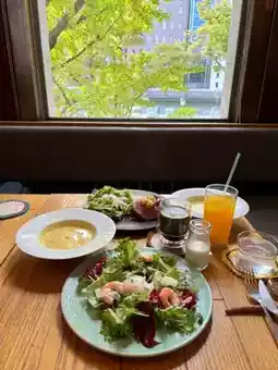 Sitting by the window, watching the trees and river outside🌳 The atmosphere is so comfortable it feels like a movie scene, full of quality~ The set menu includes corn soup + salad + dessert + coffee/juice🍹 You can also order à la carte, and there’s a thoughtful seasonal menu!