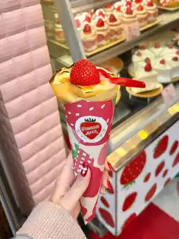 🍓There are also strawberry candied hawthorns, strawberry crepes, strawberry cakes, strawberry daifuku, and more. The strawberry daifuku is soft and chewy with a nice bounce!
