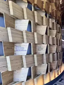 Constructed from wooden blocks, the Poland Pavilion’s exterior walls resemble woven art, while the interior combines plants, fragrances, geometric designs, and interactive technology, exuding a calm and healing atmosphere🌿✨.