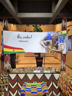 📸 Photo highlights: Welcome wall "Akwaaba!", cocoa tree display area, ethnic textiles section
