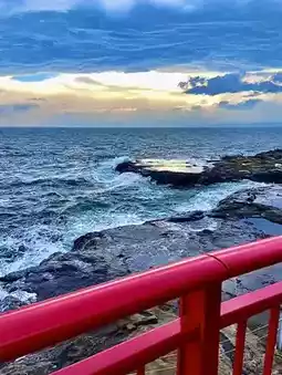 The view showed the vast sea, the harbor, and reflections of lights just turning on.
