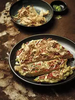 ✶ What It Is: A savory pancake made with cabbage, batter, and customizable toppings like pork, squid, or cheese, grilled on a hotplate and drizzled with sauce.