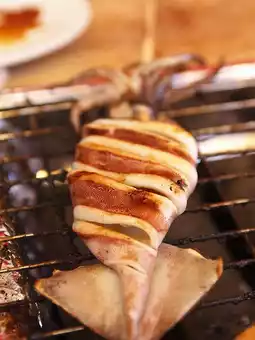 ✶ What It Is: Whole squid grilled over charcoal, brushed with soy sauce, served hot with a smoky, caramelized finish.