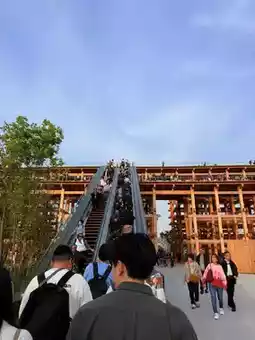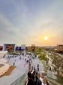 The location is just behind the East Entrance, heading towards the USA Pavilion. There is an escalator that takes you directly to the Great Roof observation deck. At 12 meters high, equivalent to a four-story building, you can overlook the core exhibition area. Whether it’s the USA and France pavilions on the left or the Ireland pavilion with its golden ring on the right, the setting sun casts a golden light, giving the pavilions a unique glow. It’s definitely the most romantic experience.