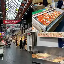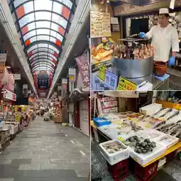 Kuromon Ichiba Market is a fish market where everyone comes to find food and souvenirs. It is a fish market that opens late. Usually, you see markets open early in the morning, and if you come late, people start to leave or the goods are sold out. But this Kuromon Ichiba Market opens from 9:00 AM to 6:00 PM. The closer to noon, the more crowded and lively it gets. I think this market has almost become a tourist attraction now.