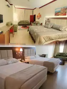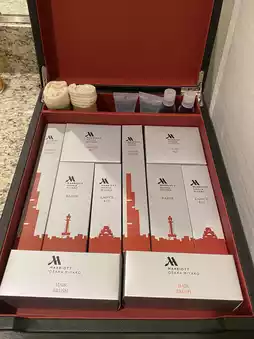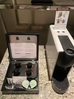 Inside the room, there is a Nespresso machine, BOSE speakers, and fluffy room wear.