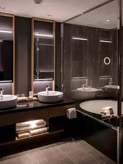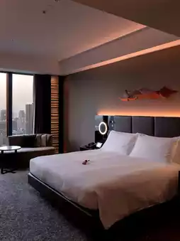 All rooms are located on the 33rd floor or higher, offering breathtaking views from every room. At night, you can enjoy a luxurious bath time or room service while gazing at the sparkling city lights🛁🍷. Sophisticated interiors and art pieces are displayed throughout the hotel, making you feel as if you are staying inside an art museum🎨✨