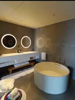Highly recommended is the bar "LIVING ROOM" for nighttime🍸 Featuring a DJ booth, it’s a trendy spot visited by non-guests as well. At night, the building’s lighting and design objects glow, creating an experience like being inside a photogenic art event🌃💃