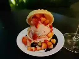 The champagne is a rosé with a pink hue, served as Moët & Chandon Rosé. The monaka is about the size of a Whopper Junior burger, topped with two types of strawberries, harmoniously paired with two kinds of strawberry and raspberry ice cream.
