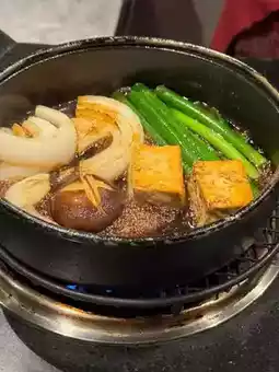 Sukiyaki also includes a serving of vegetables, udon noodles, and rice