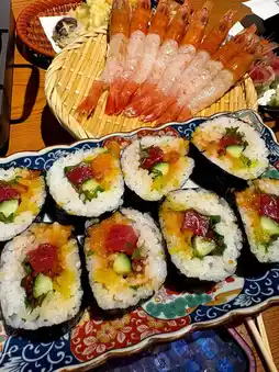 The tempura platter features large prawns fried to a golden crisp, and the vegetables are juicy. They were gone in just a few bites, so we ordered an extra plate of corn tempura, which was incredibly sweet. The sushi with small pieces of raw egg yolk and seafood is so exquisite, both fragrant and refreshing—it’s the taste of happiness.