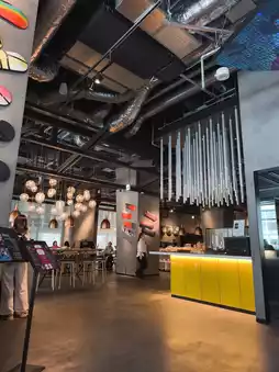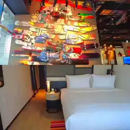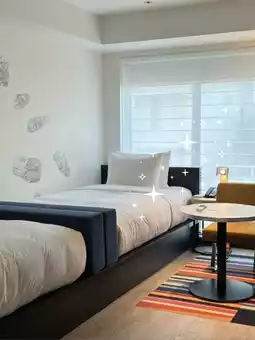 The exterior is stylish, and inside the hotel, neon × art × music create a playful atmosphere.
