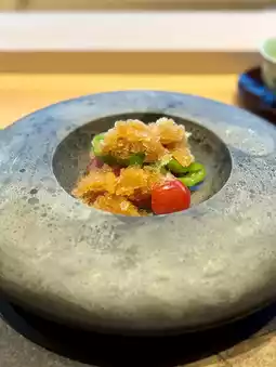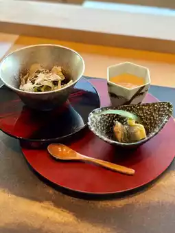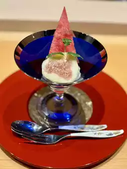 The appetizer is impressive with its tart plum and fragrant sweetfish, while the edamame tofu and conger eel soup is refreshingly summery. The grilled sea bass has an exquisite blend of the sweetness of the onion miso and the tartness of the mountain peach, while the potato and octopus nankin has a gentle flavor. The melting umami of the seared Japanese black beef is a perfect match with the refreshing coolness of the Kamo eggplant.
