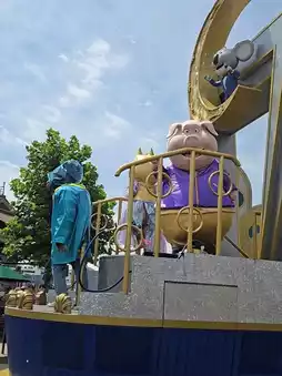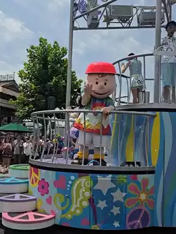 Everyone gets soaked with an unbelievable amount of water pouring down from floats, entertainers, overhead, and from all directions!