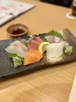 This platter features exceptionally fresh red sea bream, bluefin tuna, salmon, squid, and yellowtail. Each has an exquisite texture and fat content, and the dish is visually stunning.