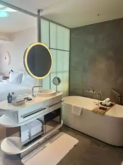 The room I stayed in was a Wonderful Room with a Skyline View on a high floor. From the large windows, you can enjoy a panoramic view of Osaka. The bed was incredibly spacious, and the bathtub featured charming interior design. My favorite part was the adorable round mirror in the sanitary room. The room had a sparkling neon-lit design, characteristic of W Hotels.