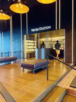 The front desk is on the 29th floor, and the design seems to be inspired by the station's interior.