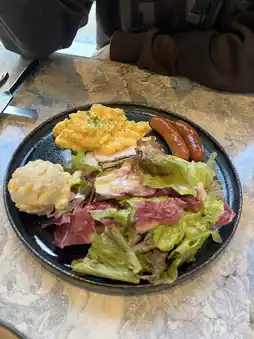• American-style breakfast: A hearty spread with scrambled eggs, sausages, hash browns, and bacon.