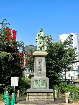 The shrine features traditional Japanese architecture and features a stone lion (komainu) at the entrance.