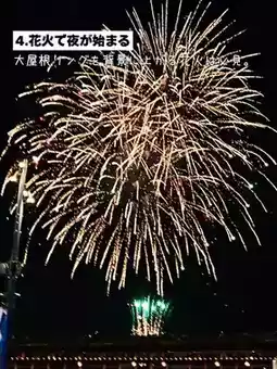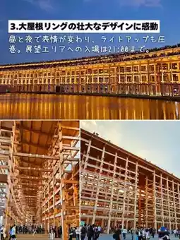 → Don't miss the fireworks that light up the night sky against the Great Roof Ring. Fireworks time is a popular time to see the fireworks, so it might be a good time to line up at the pavilions.