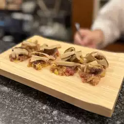 The octopus is finished with mountain wasabi rubbed right in front of you. It's chewy yet soft, making it a perfect pairing with sake!