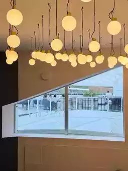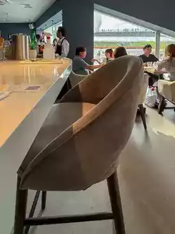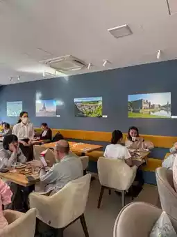 The refreshing white-blue interior is reminiscent of a bistro, with popular window seats where sunlight pours in.