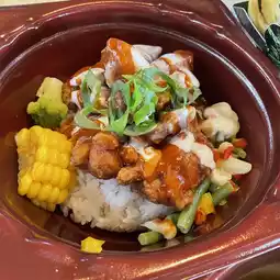 Scotch egg, mini curry rice, fried chicken, cherry tomatoes, broccoli, dessert, orange drink