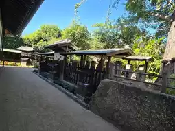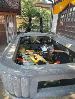 The temple grounds feature an approximately 800-year-old camphor tree and the White Dragon Pond, where large Nishikigoi carp swim.