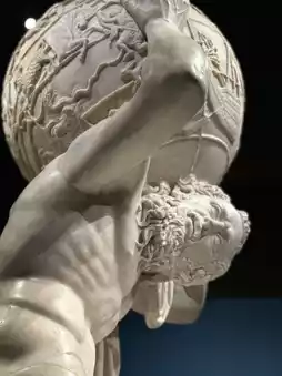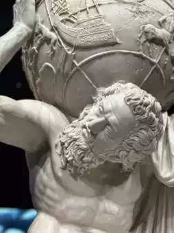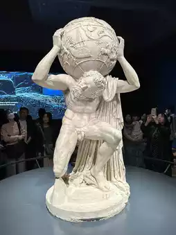 Atlas is holding a celestial globe on his shoulder. It's said to represent Atlas's role as a figure holding up the celestial globe, ordered by Zeus to do so as punishment for losing a battle with the Olympian gods. 🌎