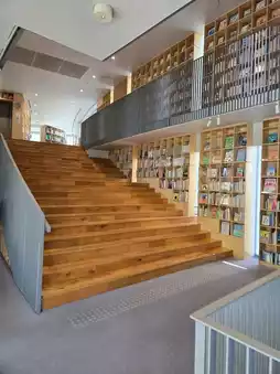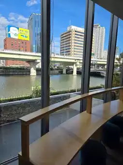 The building, designed by Tadao Ando, features a three-story atrium with staircases and bridges. The walls are lined with bookshelves, creating a uniquely designed space where visitors can enjoy reading. The passageways leading further inside are also packed with books. There is a space by the windows where you can read while enjoying views of the Dojima River.