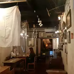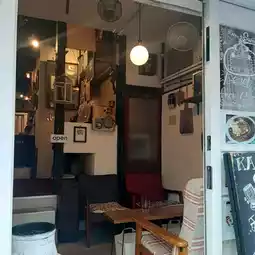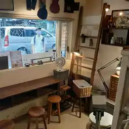 The interior is dimly lit and lined with antique accessories, creating a calm atmosphere 🍀